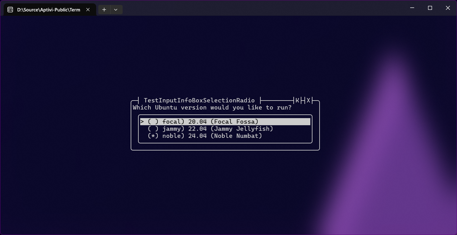 This info box style uses the choice-based input to define choices that the end user will have to select one of them. Plus, you can search for a choice using the F key to initiate a regex-based search for maximum flexibility. You can use this style with the InfoBoxSelectionColor class.
