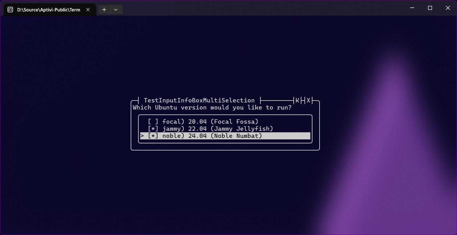 This info box style uses the choice-based input to define multiple choices that the end user will have to select one of them. Plus, you can search for a choice using the F key to initiate a regex-based search for maximum flexibility. You can use this style with the InfoBoxSelectionMultipleColor class.