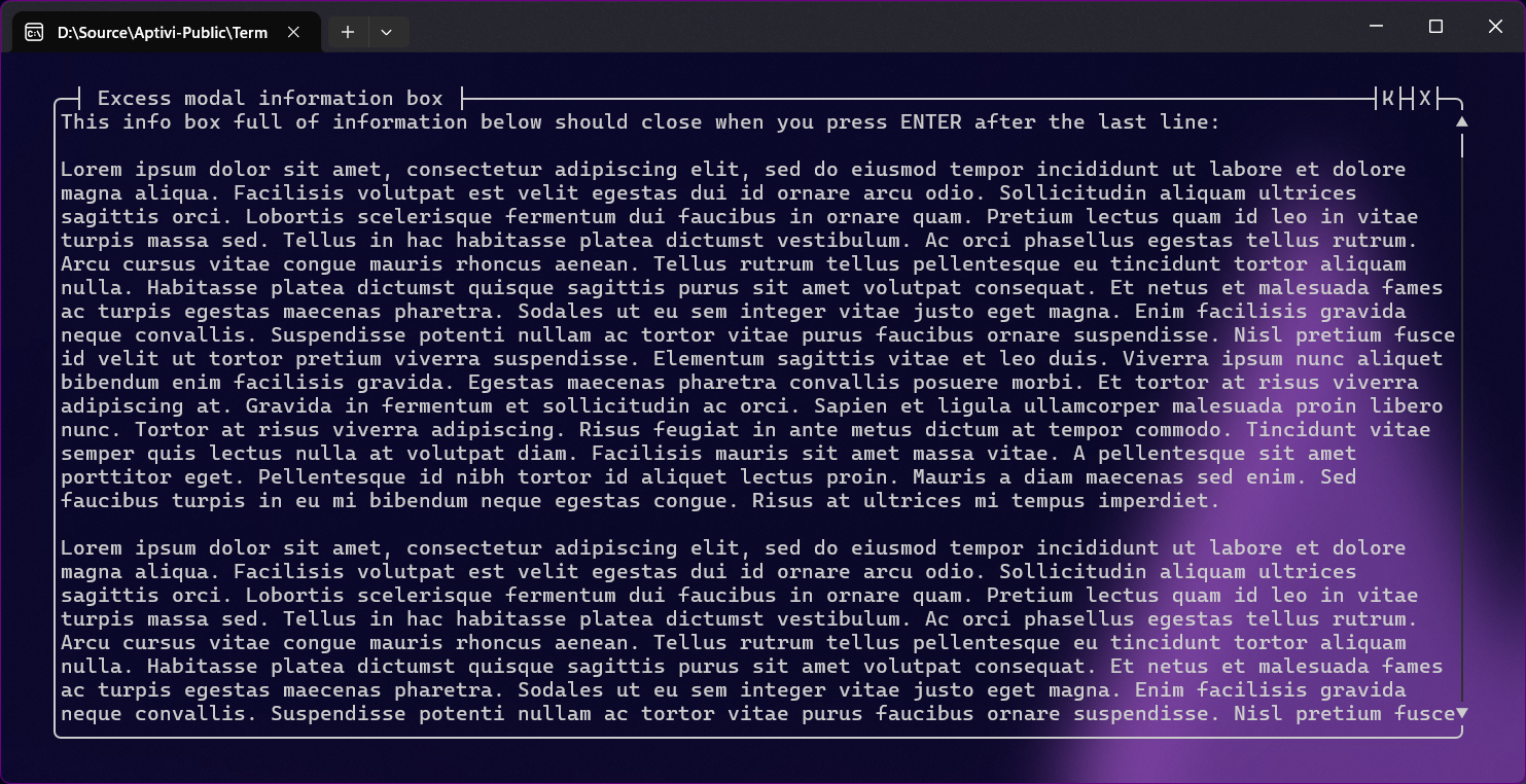 Informational box styles of this nature are modal. They require input from the end user in order to present information to the user with action. These boxes are common in interactive console applications where information is to be conveyed to the user. They are presented in a different style, based on how or what action the user needs to take, and their borders are customizable with the BorderSettings instance.
