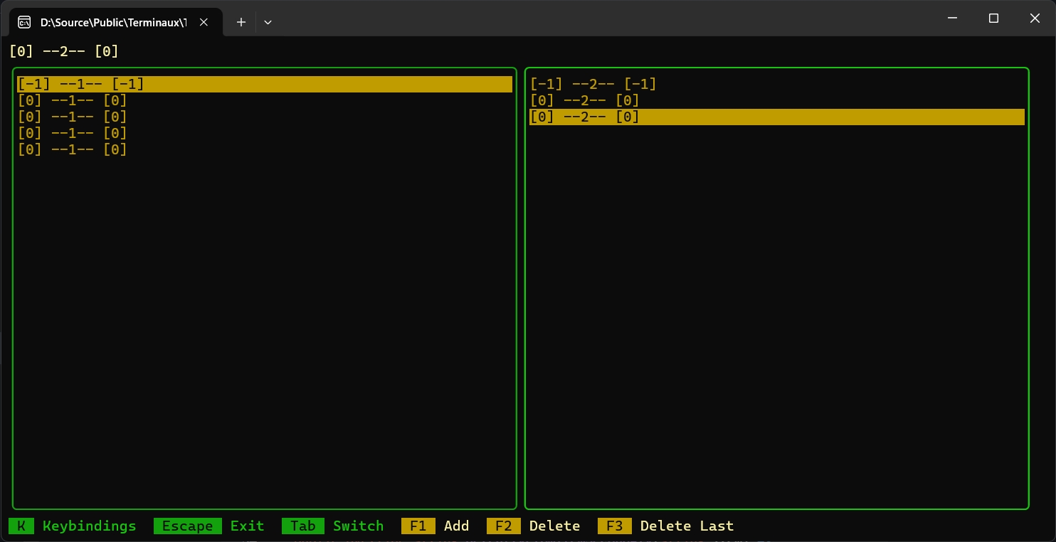 tui.Bindings.Add(new InteractiveTuiBinding<string>("Delete Last", ConsoleKey.F3, (_, _, _, _) => tui.RemoveLast(), true));