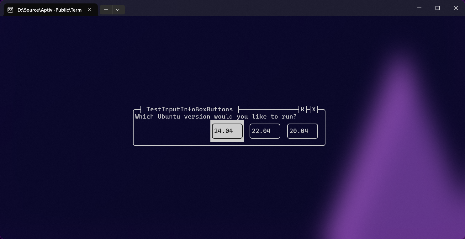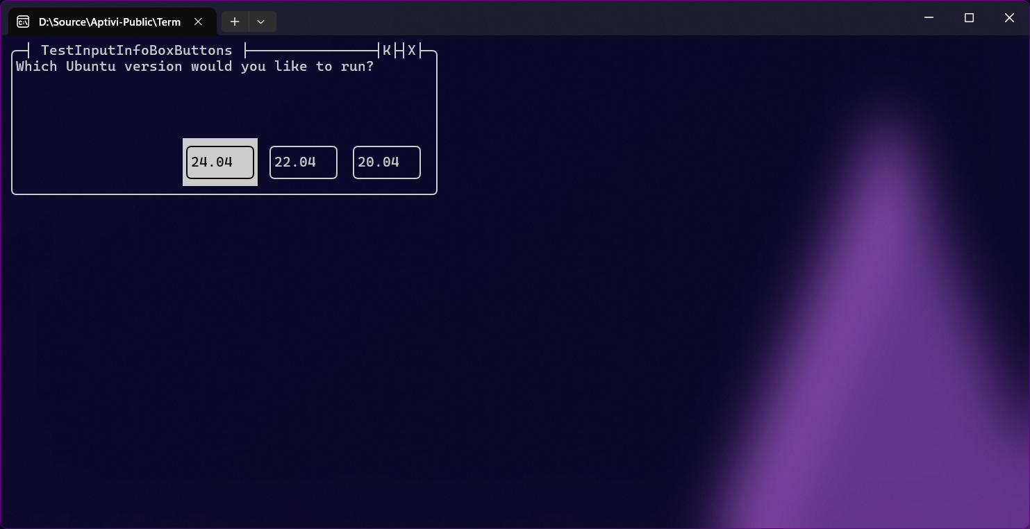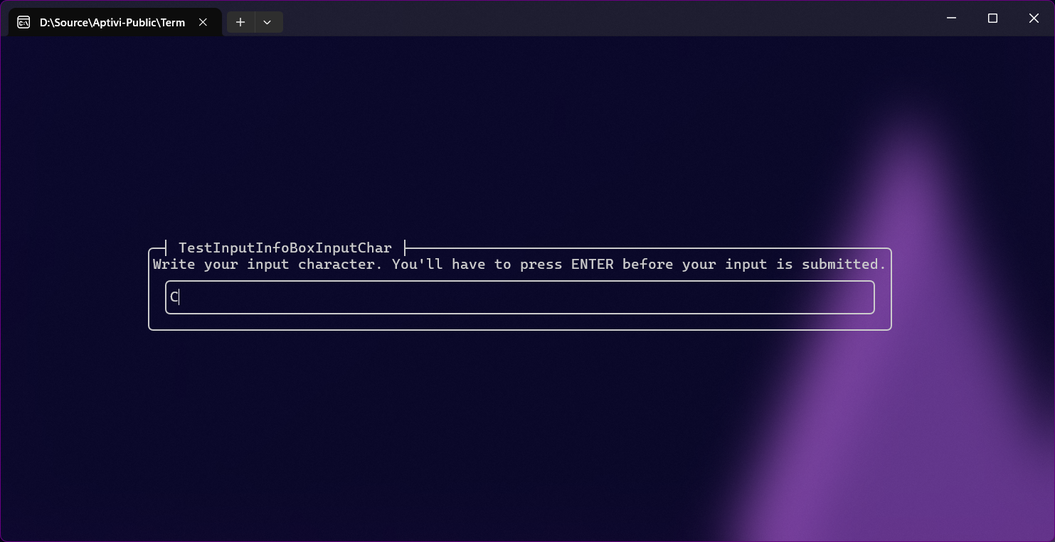 This style uses the input reader that takes the first character from the input string, based on the informational box contents. For example, if this informational box tells an end-user to write a character to specify a box border character, the user will have to write it. You can use this style with InfoBoxInputColor with specifying the InfoBoxInputType as Character.